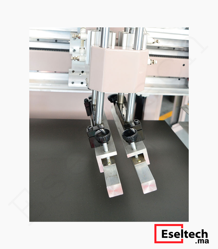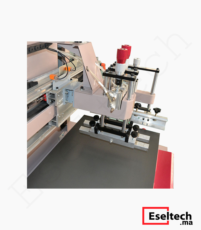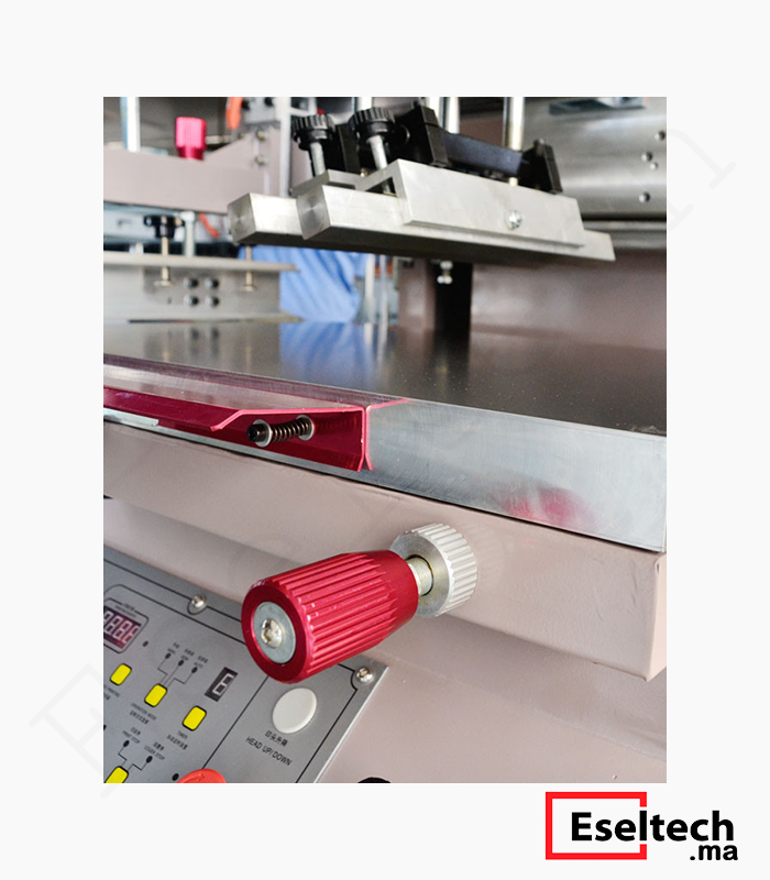 Réglage de Précision : Contrôle pneumatique de la racle, cellule photoélectrique pour contrôler la course (réglable indépendamment) et colonnes guides doubles pour un positionnement parfait du cadre.
